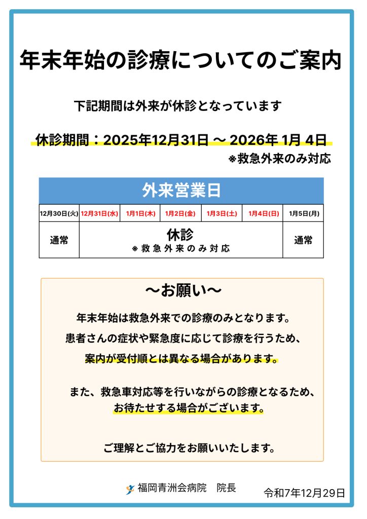当院では、年末年始期間中の外来診療について、下記のとおりご案内いたします。